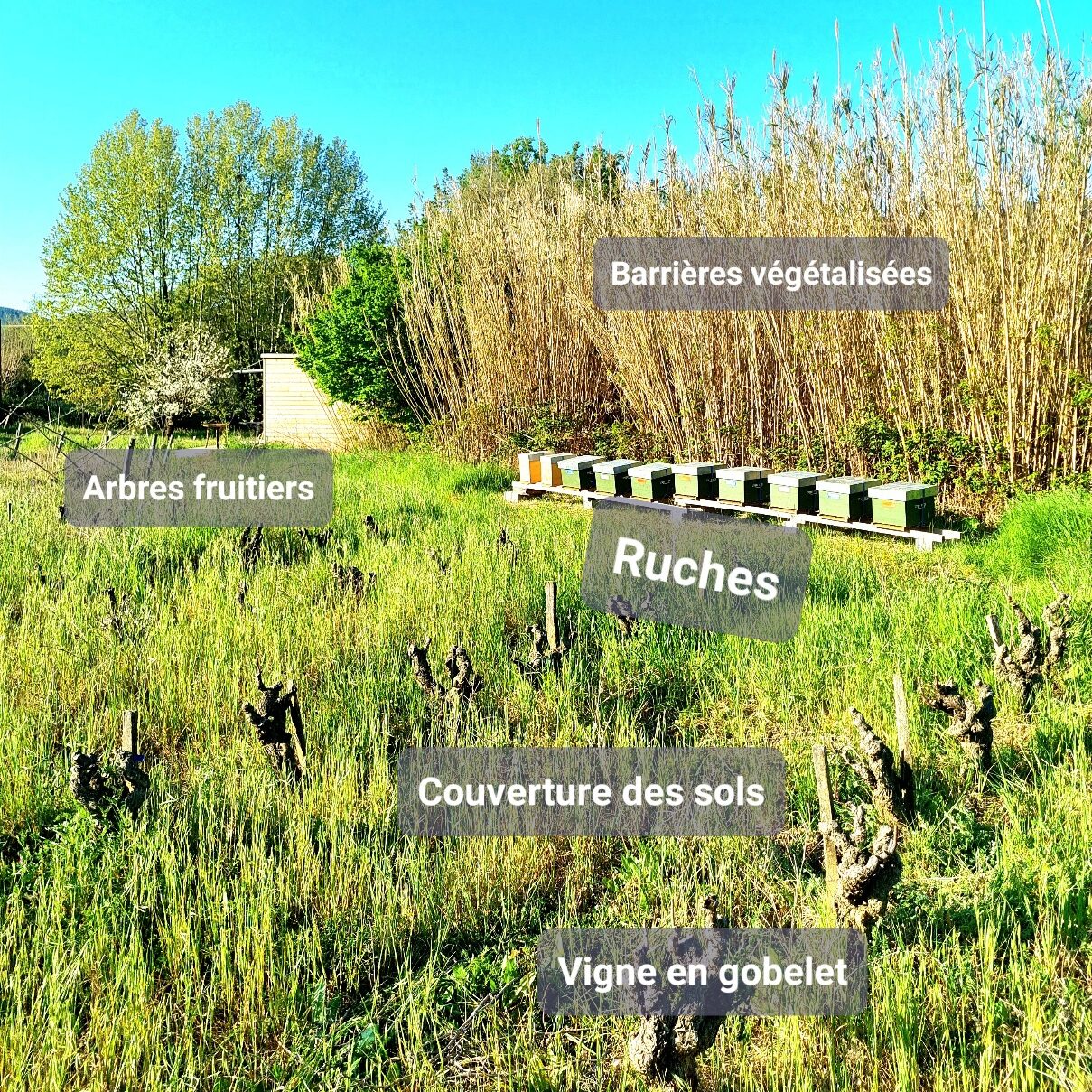 - Vigne mariée à l’arbre : associer arbres et vignes pour renforcer les équilibres naturels en revenant à la genèse du vivant.